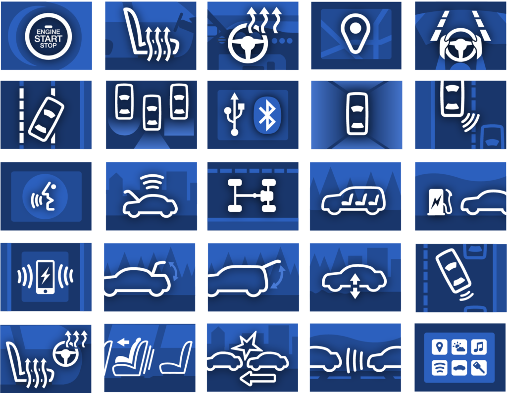 Icons created to visually represent features available in a variety of cars. These icons show up when a feature is available.
